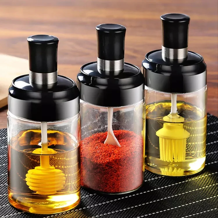 🏵️ 1 X Pack of 3 Glass Seasoning Tank Kitchen Spice Kit Bottles Pepper Spoon Seasoning Jars Brush Honey Container Food Storage Container
